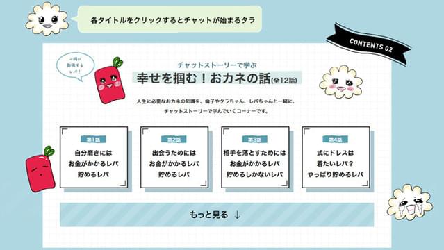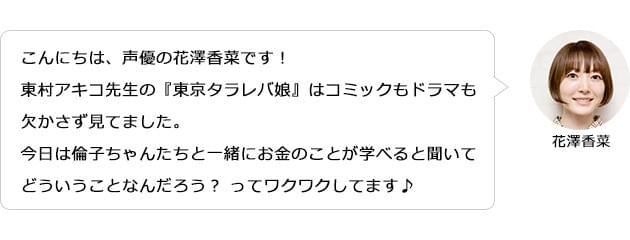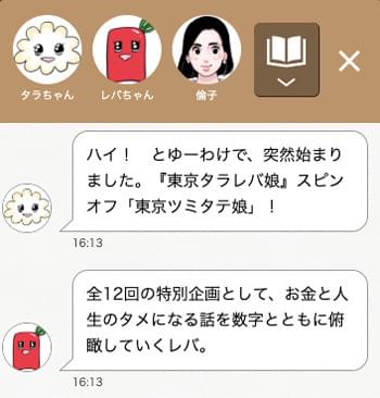 アラサー未婚女子たちを描いた東村アキコ著のコミック『東京タラレバ娘』のスピンオフ。作中のマスコットキャラ、タラちゃんとレバちゃんが、主人公・倫子さんに“しあわせになるためのおカネ”の知恵を解説していくネットコンテンツ(無料)なのだ。