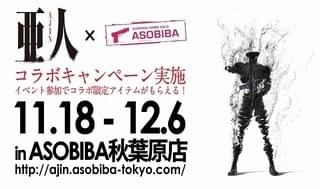 秋葉原のサバイバルゲームフィールド「ASOBIBA」では、11月18日から12月6日まで、通常のルールとは異なる「亜人」特別ルールのゲームを開催する。決して死なない亜人と、亜人の捕獲と研究を行う「対亜人特別捜査本部」との戦闘をサバイバルゲームで体験できるという内容で、キャンペーン期間中に来店すると「亜人」オリジナルグッズがもらえる。