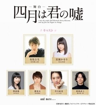 舞台版メインキャストも公開された。公生役にはテレビドラマ「男水!」の安西慎太郎、かをり役には実写映画「暗殺教室~卒業編~」の松永有紗がキャスティングされた。このほか、公生の幼なじみである澤部椿役は河内美里、女子から人気を集めるサッカー男子・渡亮太役は和田雅成、公生に憧れてピアノを始めた井川絵見役は山下永夏、絵見と同じ動機でピアノを始め公生を目標としていた相座武士(あいざたけし)役は横井翔二郎が演じる。さらに、今作の軸となる音楽シーンではプロの奏者による生演奏が行われる。