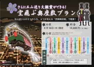また、8月16日には30人限定の「空飛ぶ奥座敷プラン」も用意されており、通常のツアースケジュールに加えて、西陣織会館で京都の夏の風物詩・五山送り火を観覧できる。価格は1万600円(税込み)で、別途5000円で「ゆば処 静家」の送り火限定メニューを味わうことができる。