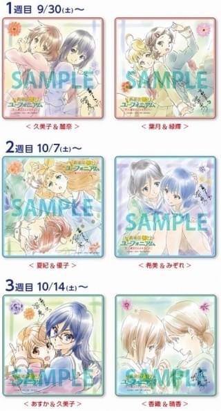 9月30日公開の「劇場版 響け!ユーフォニアム~届けたいメロディ~」の入場者特典が発表された。キャラクターデザインの池田晶子による描きおろしイラストを使用したオリジナルコースター(全6種)で、9月30日から10月6日までの公開第1週は「黄前久美子&高坂麗奈」か「加藤葉月&川島緑輝」、10月7日から10月13日までの第2週は「中川夏紀&吉川優子」か「傘木希美&鎧塚みぞれ」、10月14日から20日までの第3週は「田中あすか&久美子」か「中世古香織&小笠原晴香」、いずれかの絵柄がランダムで数量限定配布される。
