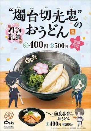 放送中のテレビアニメ「続 刀剣乱舞-花丸-」と、讃岐うどんチェーン「はなまるうどん」のコラボレーションが決定した。3月1~14日の期間中、第7話に登場したお祭りのうどんを再現し、冬向けのアレンジを加えた「燭台切光忠のおうどん」が、全国28の「はなまるうどん」店舗で販売される。