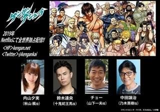 アニメ「ケンガンアシュラ」が、2019年にNetflixで全世界独占配信されることが決定し、メインキャストが発表された。主人公である謎の闘技者の十鬼蛇王馬(ときたおうま)を鈴木達央、王馬の戦いを目撃してしまったサラリーマンの山下一夫をチョーが演じる。そのほか、大企業・乃木グループの会長である乃木英樹役を中田譲治、乃木に仕える美人秘書の秋山楓役を内山夕実が担当する。