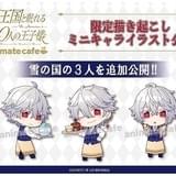 さらに、7月26日~8月28日までアニメイトカフェ新宿、sisters池袋、アニメイトカフェグラッテ吉祥寺、岡山、アニメイトカフェショップ京都で行われる本作のコラボカフェに、雪の国の王子3人が登場することも決定した。アニメイトカフェショップ新宿、sisters池袋では王子たちをモチーフにしたコラボメニューやタピオカドリンク、アニメイトカフェグラッテ吉祥寺、岡山・アニメイトカフェショップ京都ではドリンクの上のクリームに王子たちがプリントされたグラッテとアイシングクッキーなどを提供するほか、各店舗では描き下ろしイラストやミニキャライラストを使用したグッズも販売予定。なお、各メニューを注文すると限定描き起こしミニキャライラストを使用したコースター全13種からランダムで1枚が配布される。