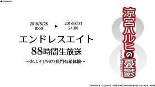 「『涼宮ハルヒの憂鬱/エンドレスエイト』88時間生放送~およそ1/9077長門有希体験~」では、「エンドレスエイト」での繰り返される夏休みの中、SOS団の団員である長門有希のみがループ現象に気付いているという境遇を体験するため、8月28日午前8時から31日深夜12時までの合計88時間、テレビアニメ第2期の第12~18話が、話ごとに異なるURLで配信される。全話を同時に視聴すると合計616時間(7×88時間)ぶんになり、夏休みの15日間を1万5532回もループした長門の時間軸の約1/9077を体験できる。タイムシフト視聴は、9月1~8日までの8日間限定。