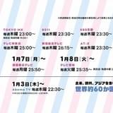 同作の放送スケジュールも決定した。1月3日午後11時からTOKYO MX、午後11時30分からBS11、KBS京都、深夜12時からサンテレビで放送を開始する。4日深夜1時56分から青森放送、7日深夜1時50分から静岡朝日テレビ、8日深夜1時35分からテレビ愛知でもオンエア。Abema TVでの初回配信は、1月3日午後11時からスタートする。また、北米、欧州、アジアほか世界60か国でも配信予定。さらに、TOKYO MXでは、第1話放送翌日の1月4日から、第2話放送前日の9日まで、毎日1回、第1話の再放送が行われる。