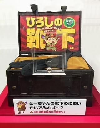 主人公・野原しんのすけの父であるひろしの靴下は、あまりの悪臭から、映画シリーズでは、たびたび敵を撃退する武器や、失った記憶をよみがえらせるキーアイテムとして用いられている代物。このほど展示される靴下は、2017年開催の「クレヨンしんちゃん展」で公開されたものと同様、見た目はごく普通だが、作中での悪臭が再現されている。アクリルケースの小窓を開くことで臭いをかぐことができるが、「小さなお子様や、臭いに敏感な方は充分ご注意ください」とアナウンスされているほか、ケースには「ふたの閉め忘れに注意だゾ!」というしんのすけからの注意書きも記されており、自己責任での体験となる。