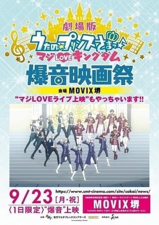 「劇場版 うたの☆プリンスさまっ♪ マジLOVEキングダム」を爆音上映する「劇場版 うたの☆プリンスさまっ♪ マジLOVEキングダム 爆音映画祭」が、9月23日に大阪・MOVIX堺で開催されることが決定した。音楽用のライブ音響システムを使用する“爆音上映”の第一人者として知られる樋口泰人氏(株式会社boid)によるプロデュースで行われ、コンサートライトの使用や声援などが許可される“マジLOVEライブ上映”も実施される。