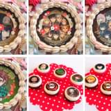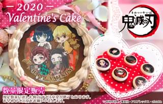 バレンタインスイーツには、主人公の竈門炭治郎(かまどたんじろう)や、その妹の禰豆子(ねずこ)、「鬼殺隊」の隊士である我妻善逸(あがつまぜんいつ)、嘴平伊之助(はしびらいのすけ)といったメインキャラクターや、描き下ろしデフォルメイラスト(全13種)をプリント。特典として、購入スイーツに対応したデフォルメイラストの缶バッジ(全21種のうち1つ)が付属する。なお、クリームはホイップとチョコ、ケーキに盛り込まれるフルーツは黄桃(4000円)とイチゴ(4500円)から選ぶことができる。