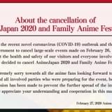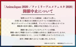 新型コロナウイルスの感染拡大を受け2月27日、主催の一般社団法人アニメジャパンが中止を発表。公式サイト()では「2月26日に発表された政府からのイベント自粛方針および、何よりアニメファンである来場者、アニメジャパンに関わるすべて関係者の安全を鑑み、開催の中止を決定いたしました。開催を楽しみにしていたアニメファンの皆様、開催へ向けご準備をされていた皆様には多大なご迷惑をおかけしますが、感染の拡大を収束するべく、このような判断とさせていただきました」と発表されている。