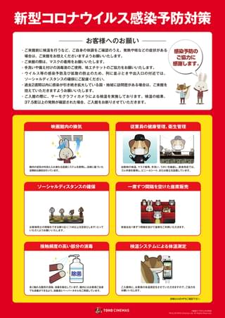 ソーシャルディスタンス(社会的距離)の確保に関しては、飛沫感染防止のため前後左右に1席ずつ間隔を空けたチェスボード盤方式で座席指定券を販売する。ロビーのソファー、廃テーブルは撤去するという。そして当面は午後8時以降開始の上映は休止する。同社の感染予防措置についての詳細は、公式サイト()で確認することができる。