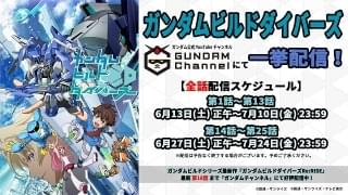 1~13話を6月13日正午から7月10日まで(配信中)、14~25話を6月27日正午から7月24日までの2回に分けて配信。なお、同作の続編「ガンダムビルドダイバーズ Re:RISE」も同チャンネルで18話まで無料配信されている。