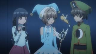 アニメ版「クリアカード編」の幕引きは、次のような内容だ。ある晩、さくらと秋穂は同じ夢を見る。秋穂は、「さくらが恐ろしい何かにつかまってしまう」という夢をめぐり、秋穂やさくら、それを見守るケロちゃんや月(ユエ)はさまざまな思いをめぐらしていく。その日の夜に、さくらの家の前に、夢に登場した怪しいローブをまとった魔術師が現れる……。