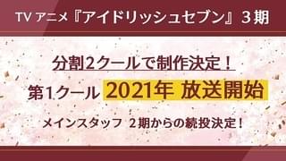 同名人気ゲームアプリをアニメ化した同作は、芸能事務所でマネージャーとして働くことになった小鳥遊紡(たかなしつむぎ/CV:佐藤聡美)が、七瀬陸(小野賢章)ら7人組みの男性アイドルグループ「iDOLiSH7」をトップアイドルへと導いていく姿を描く。18年にテレビシリーズ第1期が放送、スピンオフシリーズ「アイドリッシュセブン Vibrato」の配信を経て、20年に第2期「アイドリッシュセブン Second BEAT!」がオンエアされた。第3期の制作決定は、第2期の最終回で発表されていた。