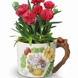 同商品は、キャラクターがデザインされたプランターカバーとカーネーションがセットになったオリジナルフラワーギフト(全3種)。プランターカバーは、花を飾るのはもちろん、小物入れとしても利用できる。