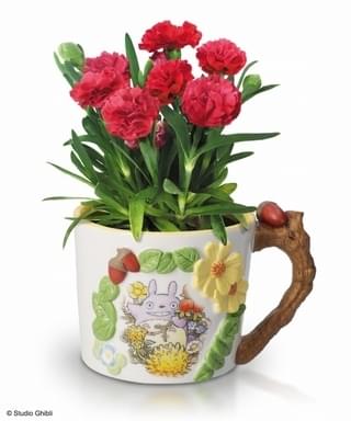 「となりのトトロ プランターカバー“トトロとお花のアーチ”」は、マグカップ型のプランターカバー(3号サイズ)とカーネーションのセットで6490円(税込み/送料込み)。プランターカバーは、水彩画タッチの大トトロを中心に、メイが見つけてきた黄色い花、ドングリ、小トトロなどが散りばめられている。
