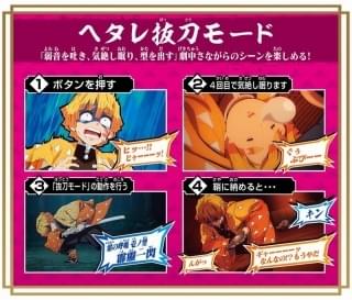 さらに抜刀モードは抜刀アクションをするたびに雷の呼吸の型の音が鳴り、ヘタレ抜刀モードは善逸の戦闘前のおなじみのパターン「弱音を吐き、気絶し眠り、型を出す」を楽しむことができる。