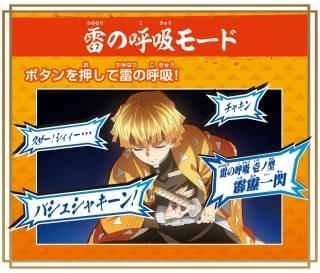 雷の呼吸モードは霹靂一閃と霹靂一閃・六連のセリフと効果音(斬撃音)が収録され、ヘタレ善逸モードは「助けてくれよ炭治郎」「禰豆子ちゃ~ん」など10種の“ヘタれたり浮かれたりしたセリフ”が流れる。