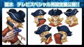 本編の先行カットは、天を仰ぐ龍水、千空と肩を並べる龍水の姿を収録。さらに、制作途中と思われる船のカットなど、原作にはないアニメオリジナルパートも収めている。