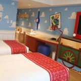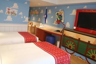 同ホテルの客室は、シリーズにおもちゃの持ち主として登場した少年アンディの部屋をイメージ。青い空と白い雲の壁紙や、まるでおもちゃのような、テレビ、ランプといった備品も取りそろえている。またアメニティも「トイ・ストーリー」をモチーフとしたものが取りそろえられている。