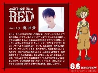 まさか! 自分が! 「ONE PIECE」の世界に関わらせていただけるなんて! 本当に夢のようです…! ありがとうございます!! でも、これだけは言っておかねばなりません! ヨルエカは!完全なるモブです! 台詞も4つくらいしかないモブ中のモブ! キング・オブ・モブです! ですが!! 僕にとってそんなことは関係ない! だって、あの尾田栄一郎先生が描きおこしてくださったキャラクターなんですから! 名前まであるし! それだけで一体どれだけ価値のあることか! 心の底から光栄です! 感謝感激です!! それに作品にとってのモブとはいえ、ヨルエカにとっては唯一つの人生ですから! 全身全霊でフィルムの中に声を残しておきましたので、ぜひ映画館でご覧ください!!(そして、あわよくば! いつかもっと台詞喋らせてください!! 尾田先生、お願いします!!!)