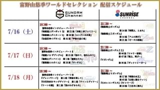 7月16~18日の3日間にわたってYouTubeで行われる、「ガンダムチャンネル」と「サンライズチャンネル」によるコラボ企画「富野由悠季ワールドセレクション」の配信スケジュールも発表された。「機動戦士ガンダム」シリーズや「無敵超人ザンボット3」「ブレンパワード」など全15作品から選ばれたエピソードがプレミア配信されるほか、「ガンダムチャンネル」では富野監督と市川による対談映像も公開される。