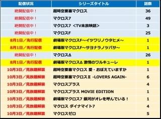 10月3日には見放題配信のラインナップに「超時空要塞マクロス 愛・おぼえていますか(映画)」「超時空要塞マクロスII -LOVERS AGAIN-(OVA)」「マクロスプラス(OVA)」「マクロスプラス MOVIE EDITION(映画)」「劇場版マクロス7 銀河がオレを呼んでいる!(映画)」「マクロス ダイナマイト7(OVA)」「マクロスゼロ(OVA)」の7作品が追加。テレビシリーズである「超時空要塞マクロス」「マクロス7」「マクロスF」「マクロスΔ」は、すでに見放題で視聴可能となっている。