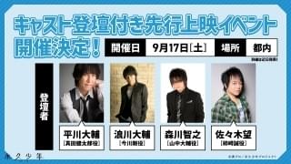 9月17日には東京都内で、先行上映イベントの開催が決定した。本編第1~4話を上映するほか、平川、浪川、森川、佐々木の4人が登壇し、同作の魅力を語る。