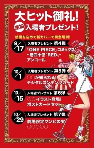第6弾入場者プレゼント「FILM REDビジュアルカードセット」は、ライブ中のウタ、戦闘中のゾロ、サンジ、ロー、さらに赤髪海賊団が勢ぞろいした劇中の名シーンに加え、原作者の尾田栄一郎氏描きおろしのルフィ&ウタ&シャンクスの海外公開記念イラストなどが描かれたポストカードセットとなっている。また、全8枚のうち、2枚は“アツいラストバトル”のルフィとシャンクスを切り取ったシークレットとなっている。