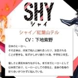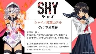 「週刊少年チャンピオン」連載の実樹ぶきみ氏によるヒーロー漫画「SHY(シャイ)」のテレビアニメ化が決定した。主人公シャイ/紅葉山テル役を、下地紫野が務める。ティザープロモーションビデオとティザービジュアルも公開されている。