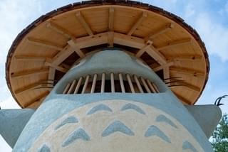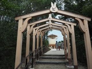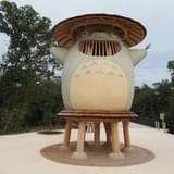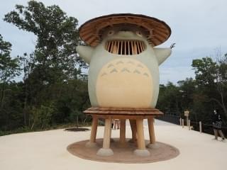 「サツキとメイの家」から、山道をのぼっていくとすぐに見えるのが、裏山の山頂にある「どんどこ堂」。トトロの形をした高さ5メートルの木製遊具で、愛知産の杉やヒノキなどが使用されている。小学年以下の子どもたちは、トトロの口のなかに入って遊ぶことができる。トトロがぐわっと口を開けた、ユーモラスな表情に癒される。