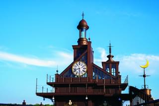 高さ30メートルのエレベーター棟は、「ジブリパーク」の北口付近にあり、来場者をジブリの世界へと導く。既存のエレベーター施設を改装し、「天空の城ラピュタ」「ハウルの動く城」などに代表される、19世紀末の空想科学的要素を取り入れたデザインとなっている。夜は棟の頂上あたりが柔らかな光に包まれ、昼とはまた違った表情を見せる。