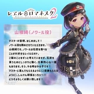 マスターの皆様、はじめまして! ノワール役を務めさせていただきます、山根綺です。 ノワールは石炭を食べることが大好きなレイルロオド。ご飯のことをずっと考えていますが、石炭をもらうためにしっかりと働く、仕事熱心な一面もあります。そう、やる時はやる子です!