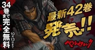 漫画「ベルセルク」の最新42巻が発売されたことを記念して、ヤングアニマルWebで1~34巻が10月13日午後11時59分までの期間限定で無料配信されている。