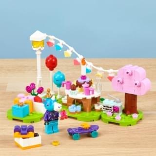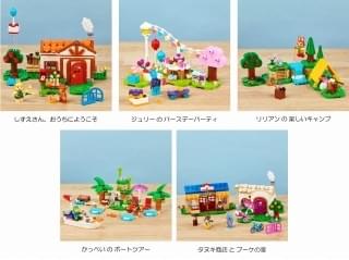 「ジュリーのバースデーパーティ」「リリアンの楽しいキャンプ」「かっぺいのボートツアー」「しずえさん、おうちにようこそ」「タヌキ商店とブーケの家」の5つのセットがラインナップ。レゴブロックで組み立てた「どうぶつの森」の風景と、ミニフィギュアになったどうぶつたちを用いて、さまざまなストーリーを再現することができる。