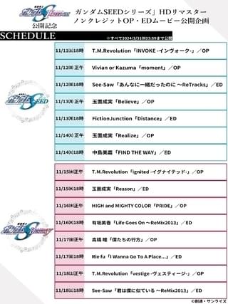 同企画では、11月11日に公開されたT.M.Revolutionによる「機動戦士ガンダムSEED」オープニング主題歌「INVOKE -インヴォーク-」を皮切りに、11月18日公開の「See-Saw」が歌う「機動戦士ガンダムSEED DESTINY」エンディング主題歌「君は僕に似ている ~ReMix2013」まで、HDリマスター版のノンクレジットオープニング&エンディングムービーを各日2曲ずつ計15曲公開する。