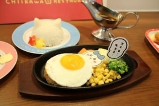 「ハチワレの目玉焼きハンバーグセット」は、「大丈夫…大丈夫…」とつぶやくハチワレにそっと目玉焼きをのせたハンバーグが特徴で、ハンバーグソースをかける際に使用する「油ハネ防止用シート」も付いてくる。ライスかパンも選択可能(ライスはハチワレ型、パンはちいかわ模様)