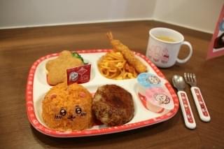 グランドメニューの「ちいかわのお子様ランチ」は、ちいかわのチキンライスをはじめ、ハンバーグ、ナポリタン、エビフライ、星型コロッケと豪華な内容。おまけのおもちゃがランダムでプレゼントされる。