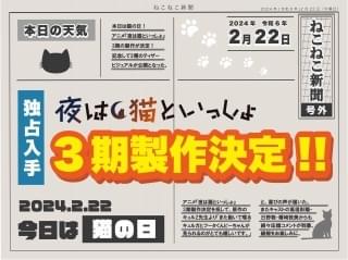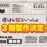 アニメ「夜は猫といっしょ」の第3期の製作が決まり、2月22日の「猫の日」に2種のティザービジュアルが公開された。原作者のキュルZ氏、キャストの高垣彩陽、日野聡、種崎敦美(崎はたつさきが正式表記)がお祝いコメントを寄せている。