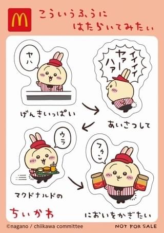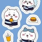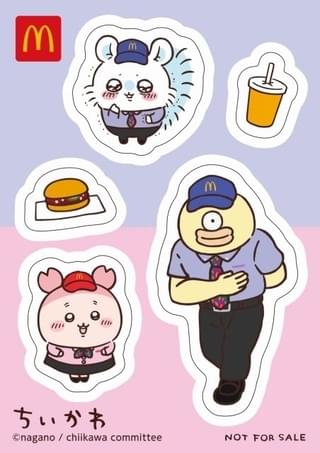 ハッピーセットと「ちいかわ」のコラボは約1年ぶり。今回は、ちいかわ、ハチワレ、うさぎ、ラッコ、モモンガなどのキャラクターが歴代クルーのユニフォームを着たオリジナルデザインのシールセットがもらえる。キャラクターが大きく描かれたシールが1枚、「こういう風に働いてみたい」というシールが1枚、仲間たちとのシールが1枚のセットで、全5種類(どれがもらえるかはお楽しみ)。
