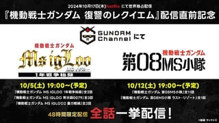 また同作の配信を記念し、ガンダム公式YouTubeチャンネル「ガンダムチャンネル」で、10月5日に「機動戦士ガンダム MS IGLOO」、10月12日に「機動戦士ガンダム 第08MS小隊」が全話無料配信されることも決定した。どちらも午後7時から48時間限定公開。なお「MS IGLOO」は「復讐のレクイエム」と同じく全編3DCGによる作品で、ザクIIや陸戦強襲型ガンタンクなどが登場。「第08MS小隊」は一年戦争における地球上での戦いを描いた作品で、グフ・カスタムや、「復讐のレクイエム」が初出となるガンダムEXを彷彿(ほうふつ7)させる機体である陸戦型ガンダムやガンダムEz8が登場する。