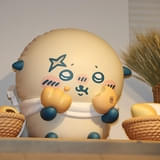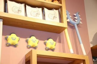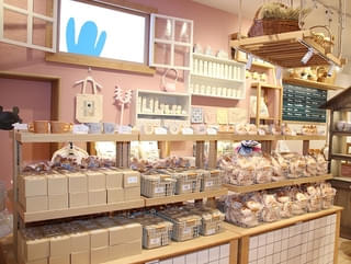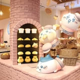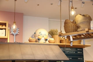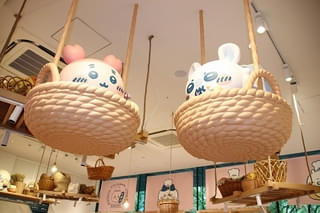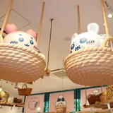 店舗のエントランスはちいかわの顔型になっており、店内に入ると、ピンクの煙突が印象的なかまどのオブジェがお出迎え。かまどのオブジェの横には、パン屋の店員に扮したちいかわ、ハチワレ、うさぎの立体オブジェが縦型に配置されている。このほかにも、店内にはキャラクターの立体オブジェが随所にあり、天井を見上げるとかごに乗ったモモンガと古本屋が向かい合い、パン売り場の横のカウンターにはカブトムシが座り、売り場の壁には“あの子”の姿もある(あの子は立体ではなく壁にプリントされている)。