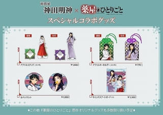 さらに物販会場では、コラボビジュアルを使用したコラボグッズ(アクリルスタンド、アクリルキーホルダー、缶バッジセットなど)を販売。また、「薬屋のひとりごと展」で販売された原作小説のグッズも取り扱う。会期中に物販会場で関連商品を購入すると、原作小説イラストのブロマイドがプレゼントされる。