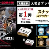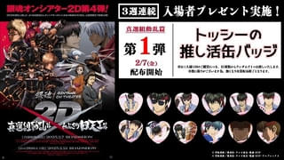 入場特典も発表され、「真選組動乱篇」第1弾は「トッシーの推し活缶バッジ」(全12種)、「かぶき町四天王篇」第1弾は「スナックお登勢 ステッカー入りマッチ箱」となっており、万事屋セットか四天王セットのキャラクター顔型ステッカーが封入される。