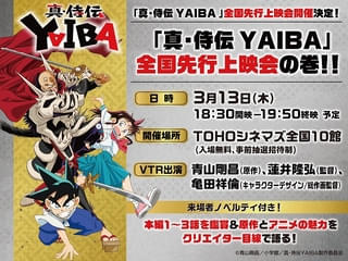 同上映会は、「真・侍伝 YAIBA」の本編1〜3話に加えて、原作者の青山氏、蓮井隆弘監督、キャラクターデザイン・総作画監督の亀田祥倫の座談会VTRも上映される。事前抽選の招待制となり、入場は無料。入場特典の配布も予定されている。第1話の舞台挨拶付き先行上映会「『真・侍伝 YAIBA』第1話完成! 新情報を超解禁の巻!!」(3月2日開催)の抽選に応募が殺到したことをうけて、今回の先行上映会の開催が決定したという。