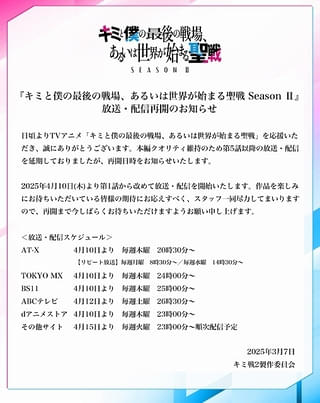 5話以降の放送・配信が延期になっていたテレビアニメ「キミと僕の最後の戦場、あるいは世界が始まる聖戦 Season II」の放送・配信の再開が決定した。4月10日より第1話から改めて放送・配信され、放送が中止となっていた第5話以降は5月8日より順次放送・配信となる。放送再開を記念した新PVも公開されている。
