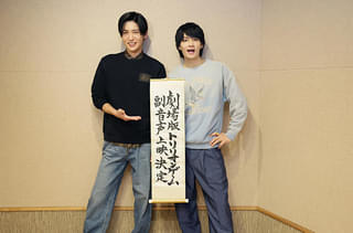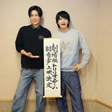 副音声上映の決定を受けて、目黒と佐野のツーショットも公開。2人が持つ巻物の文字は、書道六段の腕前を持つ佐野がしたためたもの。佐野が「(練習で)15枚くらい書きました!!」と明かすと、目黒も「字、うまいね~!!」と称賛していた。