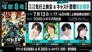 7月13日に東京・TOHO シネマズ日比谷で、本編第1、2話の先行上映会が開催されることも決まった。上映後には、内山と安元、亜白ミナ役の瀬戸麻沙美、保科宗四郎役の河西健吾による舞台挨拶が行われる。チケットの先行抽選は、6月28日に受け付け開始。