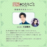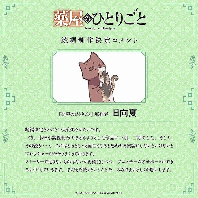 アニメ「薬屋のひとりごと」の放送が7月4日に最終回を迎え、終了後に続編の製作が発表された。あわせて、続編で描かれるであろう“新たな物語”へのヒントが多数含まれた超ティザーPVが公開。原作者・日向夏氏、メインキャストの悠木碧と大塚剛央がお祝いコメントを寄せている。