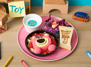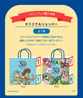 スペシャルカフェには、「トイ・ストーリー」の歴史を振り返るメニューが用意され、第1作のラストシーンをイメージした「<トイ・ストーリー>To infinity and beyond!ハヤシライスプレート」や、第2作でウッディがジェシーと初めて会うシーンをイメージした「<トイ・ストーリー2>レコード風サンドウィッチプレート」、第3作に登場するロッツォの焼却炉シーンをイメージした「<トイ・ストーリー3>裏切りのトマトグラタンプレート」(すべて税込2090円)が登場。
